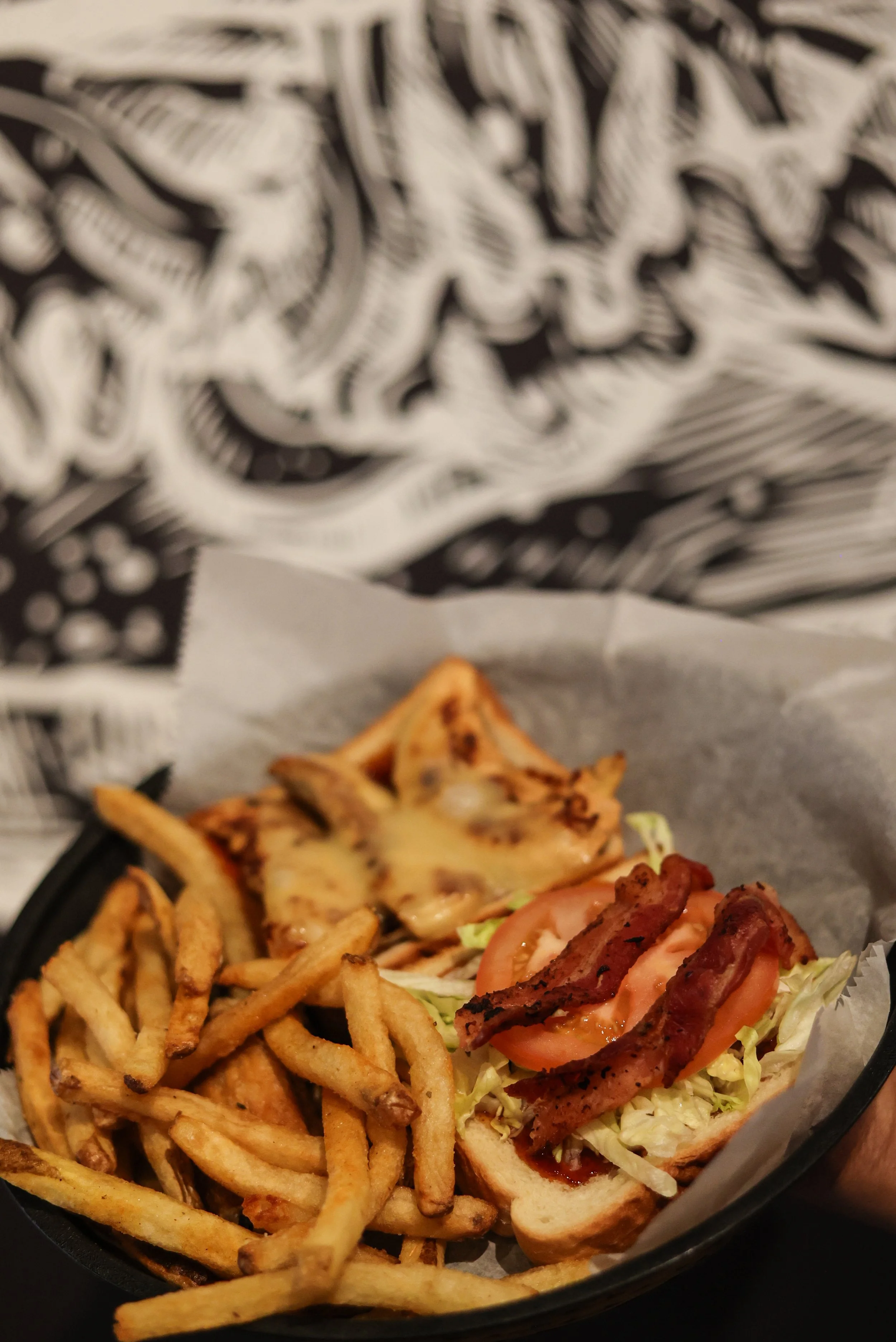 Crispy bacon, and egg cooked to order, crispy fries, lettuce and tomato